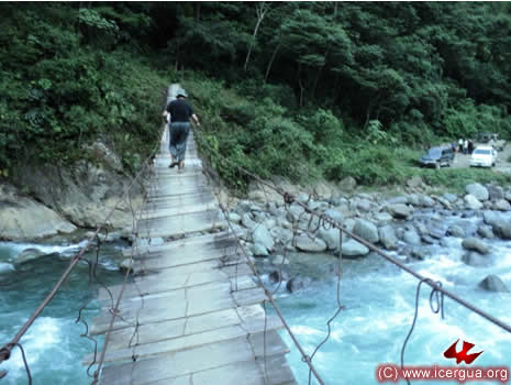 El martes 16, Monseñor Eduardo realizó la primera visita a la comunidad de La Floresta que, aunque civilmente pertenece al municipio de Soloma, es atendida, debido a las vías de acceso, desde la Parroquia de Barillas. Después de varias horas de viaje, se deja el vehículo a las orillas de uno de los afluentes del Yulá (río) San Juan y comienza la esclada de la montaña que puede durar desde dos horas y media hasta cinco o seis horas. |