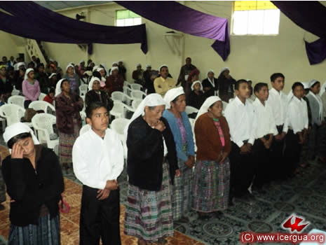 Con ocasión de la celebración unos ciento cincuenta ministros de la parroquia de la Glorificación de María, de Santa Cruz Barillas, hicieron la renovación anual de sus compromisos. A la derecha se puede observar uno de los momentos en los que los ministros están sumidos en profunda oración. |