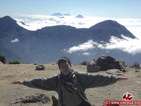 En la foto de la derecha: el seminarista José Alfredo Hernández, quien también participó en la peregrinación y al fondo, en primer plano, los volcanes Zunil y Pecul o Santo Tomás; en segundo plano los volcanes San Pedro, Tolimán y Atitlán y en tercer plano, los volcanes de Fuego y Acatenango.
