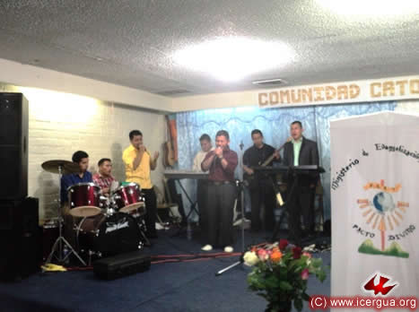 El sábado 12 por la noche, el obispo visitó la Comunidad Pacto Divino. Hace algunos meses, diversas situaciones contextuales habían provocado que ésta se quedara sin ministerio musical. El esfuerzo que han hecho entro todos los hermanos, ha permitido que actualmente cuenten ya con un ministerio bien organizado que está creciendo sensiblemente en su capacidad musical. A la izquierda se observa a los miembros del ministerio musical, mientras entonan el canto de entrada para la celebración de la Misa. |