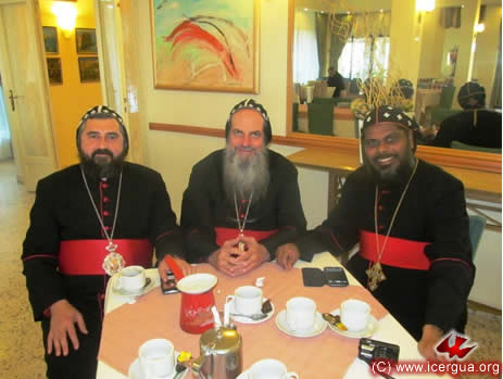 El domingo por la tarde y por la noche, fue tiempo para intercambio entre los diferentes Arzobispos que al día siguiente participarían en el Santo Sínodo de elección. A la izquierda Mor Crisóstomo Juan Gasali, Arzobispo de Argentina y Mor Crisótomo Marcos, Arzobispo del Movimiento Evangelístico de la India. En el centro está nuestro Arzobispo, Mor Santiago Eduardo. |