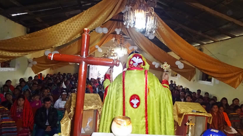 El primer por la noche, Mor Santiago Eduardo visitó la comunidad Nuevo Pentecostés, ubicada en el centro de la población de Santiago Atitlán, Sololá.