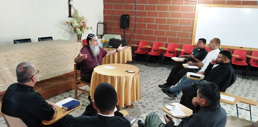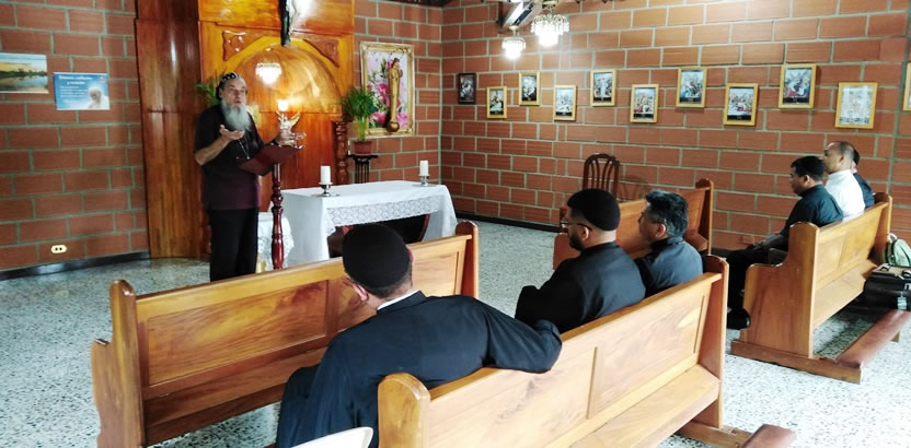 Después de la llegada y de almorzar, el arzobispo tuvo la primera reunión con el presbiterio de la vicaría. Se encontraban presentes seis de los padres, llegados de diferentes lugares de Colombia. Uno de ellos, el Padre Jeinner de Barranquilla, por razones de salud, no pudo estar presente.