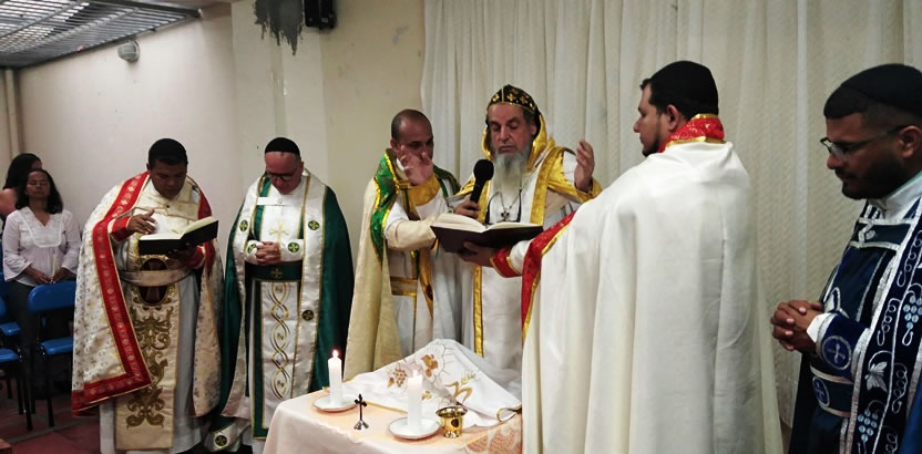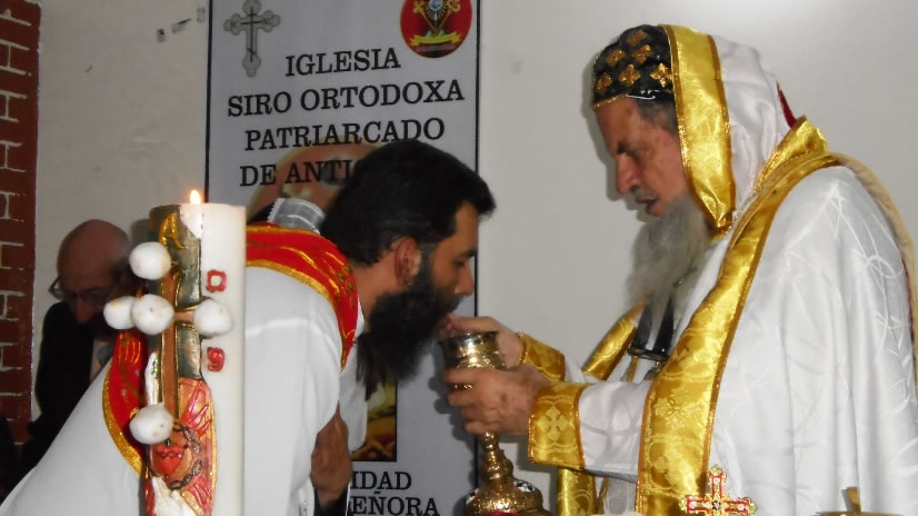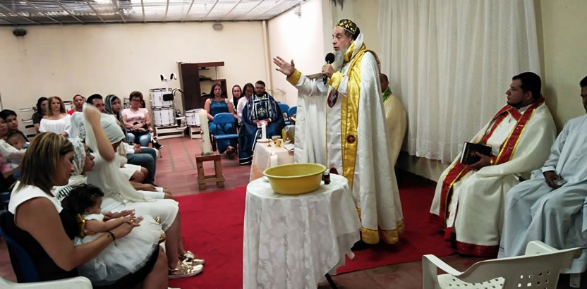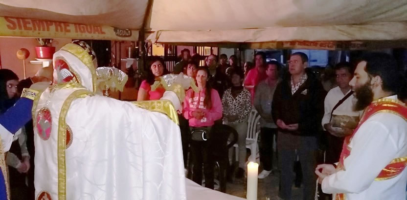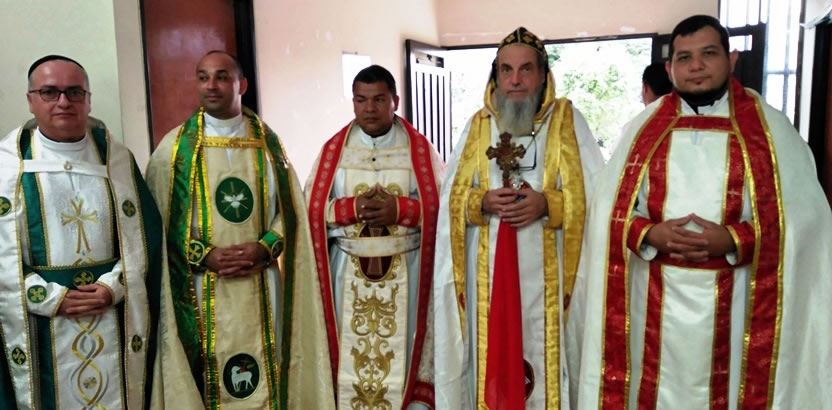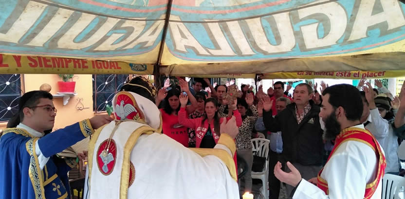 El padre Germán, junto a más de 200 fieles, se reunieron para recibir al arzobispo y para la celebración de la Divina Liturgia, en un salón, debido a que la parroquia aún no cuenta con instalaciones propias.