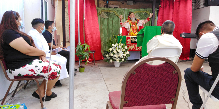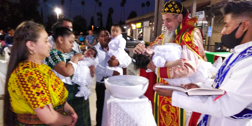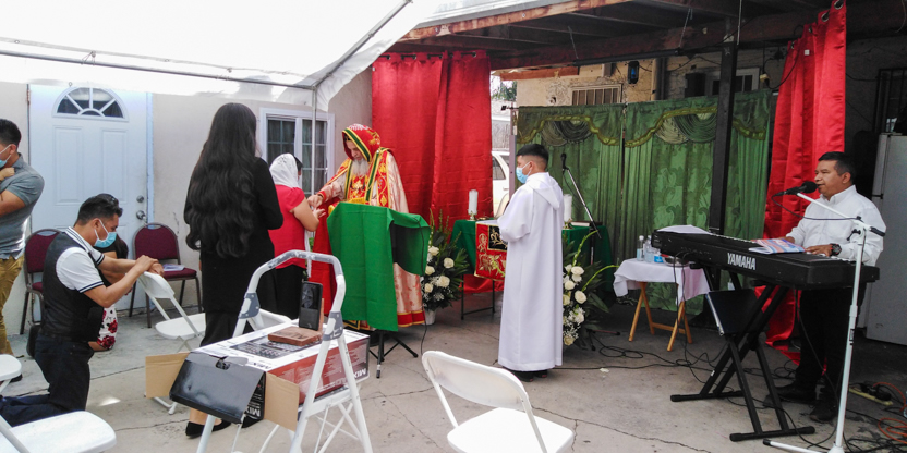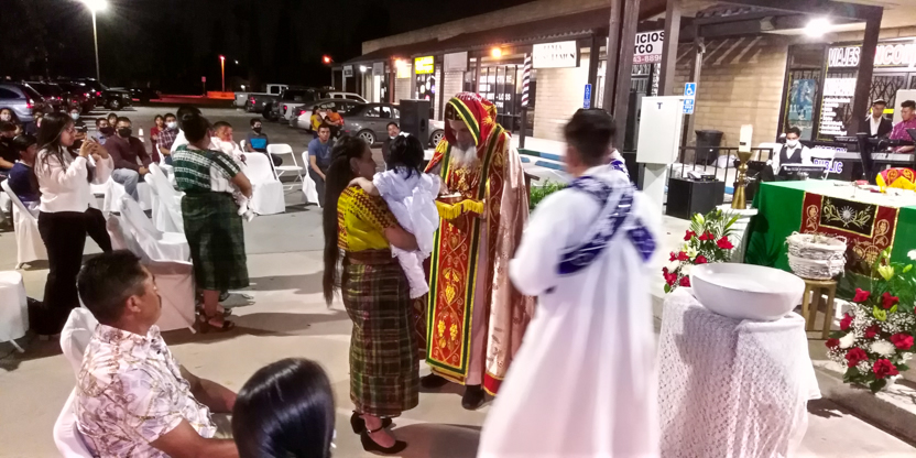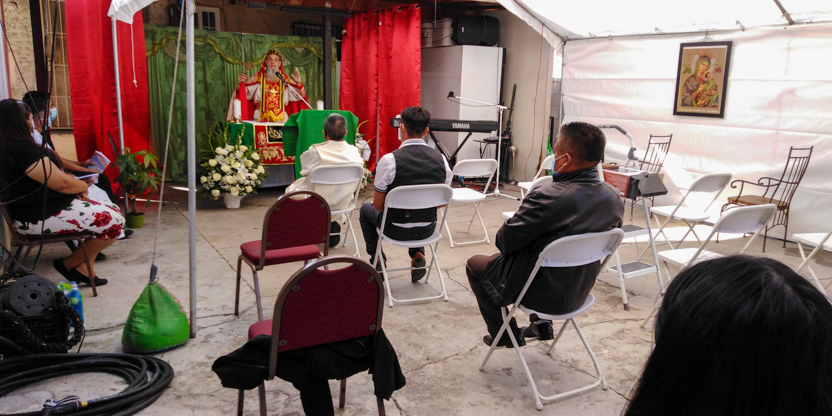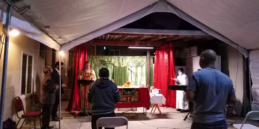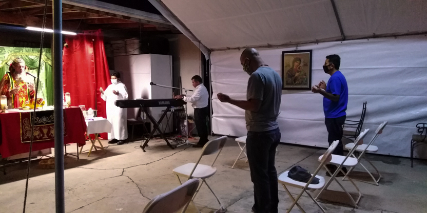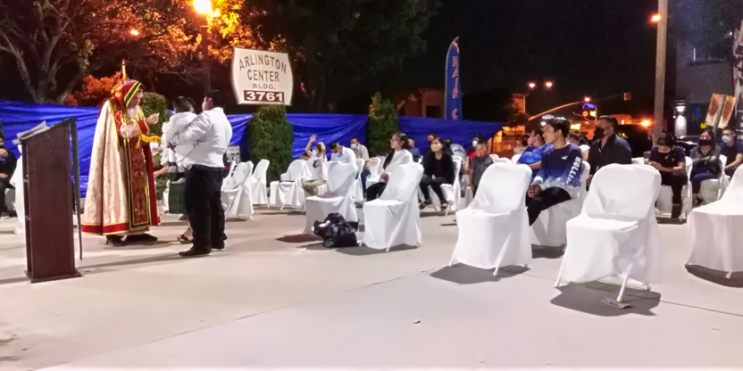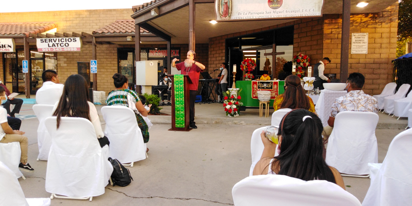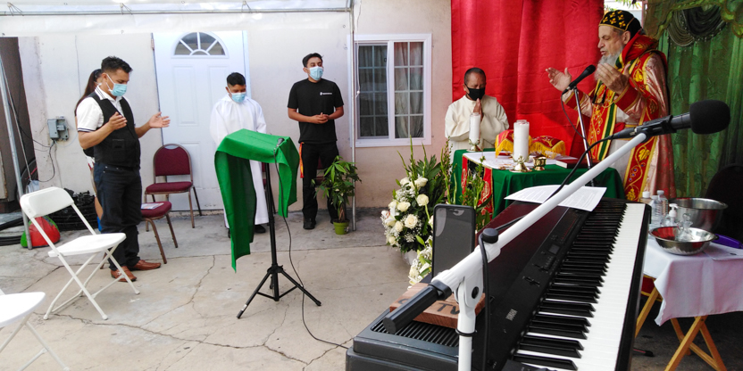 De acuerdo a las normas sanitarias que están en vigencia en el Condado de Los Ángeles, la celebración de la liturgia tuvo lugar en un área abierta, adyacente al templo.