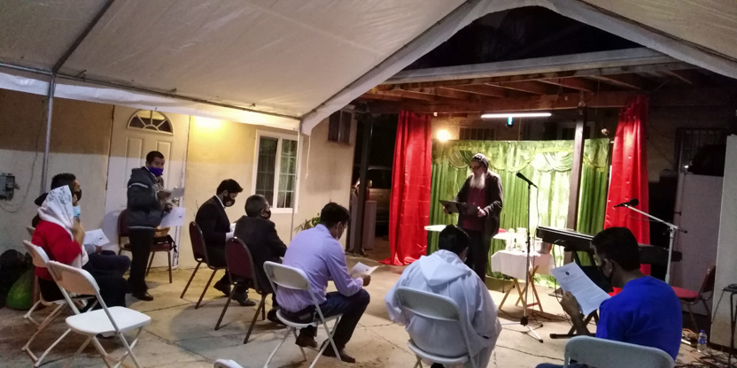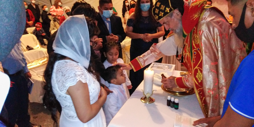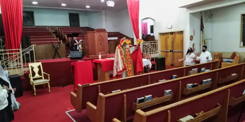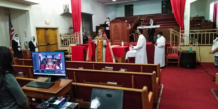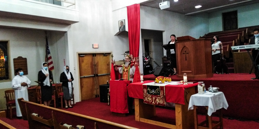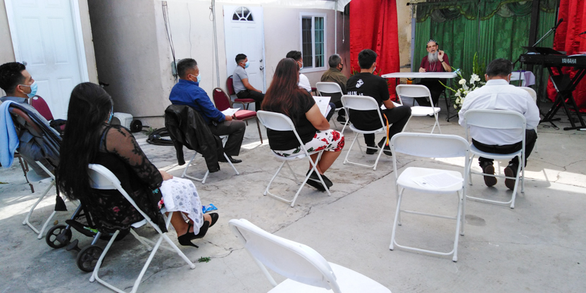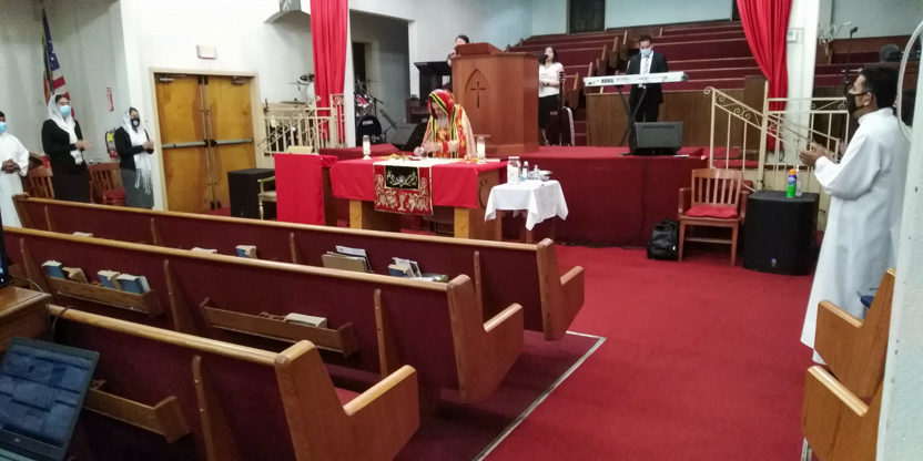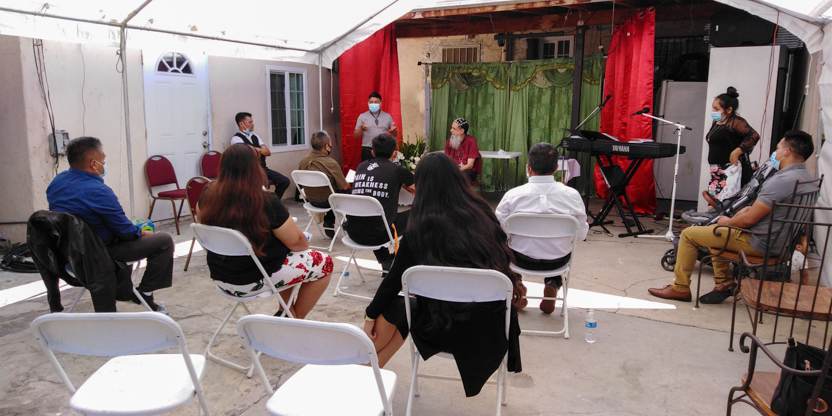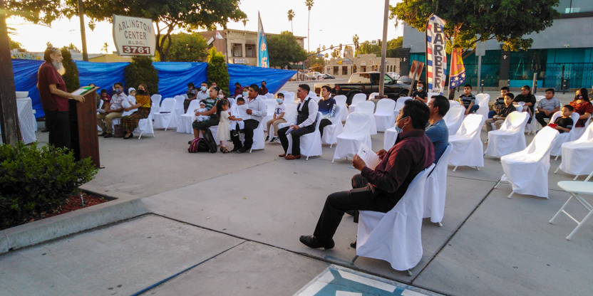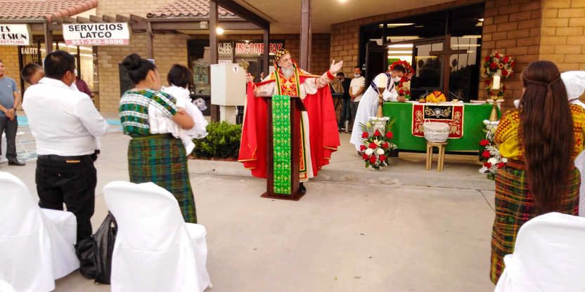 De acuerdo a las normas sanitarias que están en vigencia en el Condado de Los Ángeles, la celebración de la liturgia tuvo lugar en un área abierta, adyacente al templo.