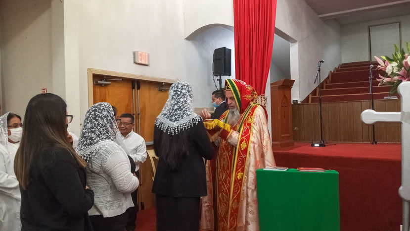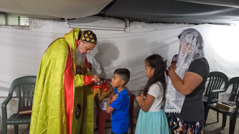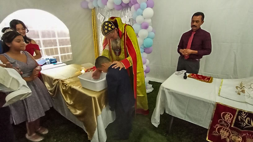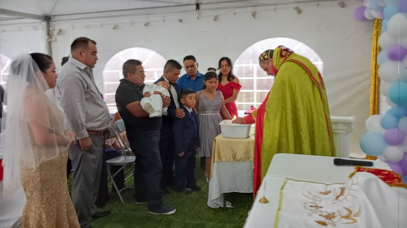 Dentro del marco de la celebración de la divina liturgia, se administraron los sacramentos de la iniciación cristiana a cuatro hermanos: un adulto, Jonathan, cuyo matrimonio también sería celebrado, sus dos hijos, y el hijo de otra familia, cuyo matrimonio había celebrado en la primera visita que el arzobispo había hecho a la comunidad.