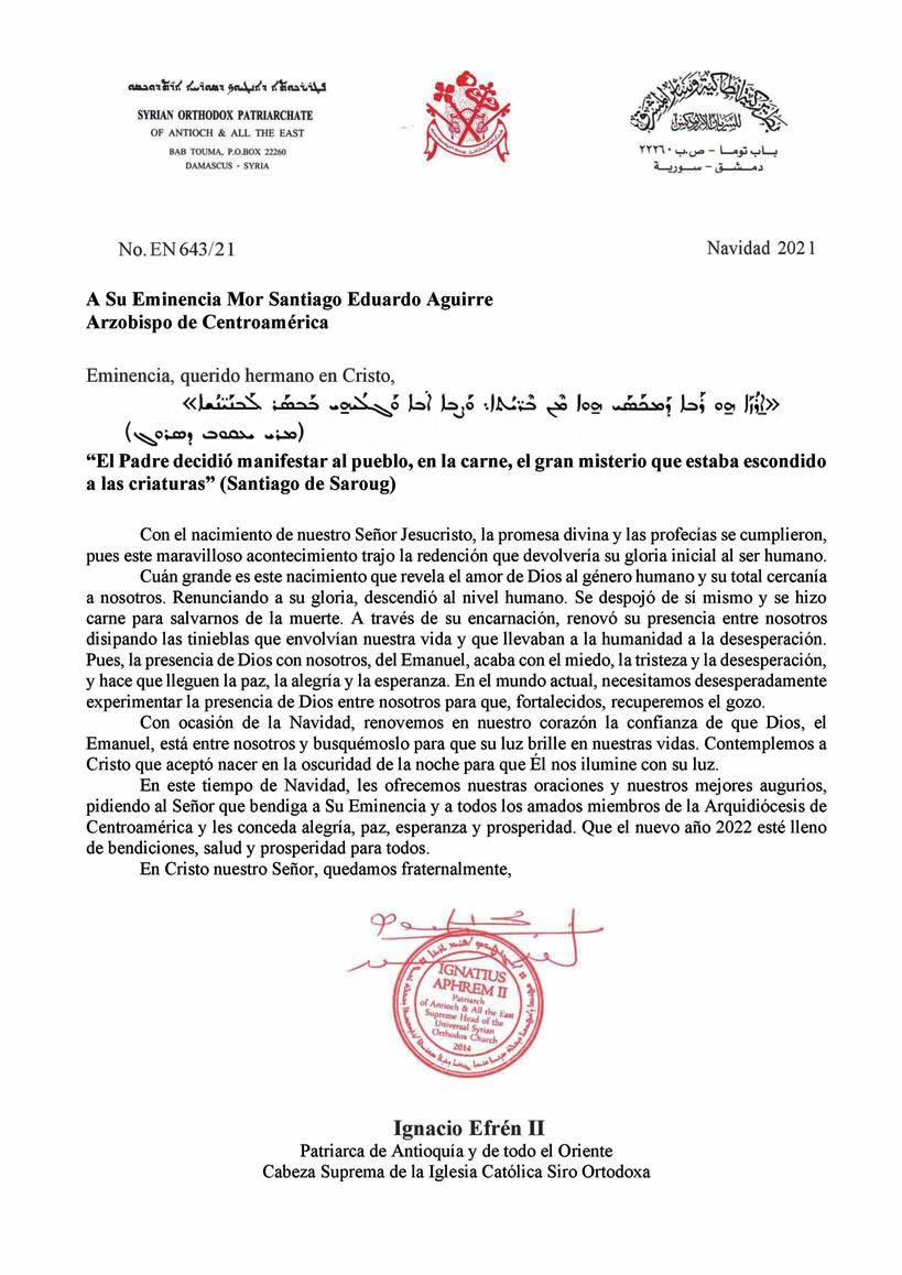 El viernes 24 de diciembre, Mor Santiago Eduardo recibió una carta de Su Santidad el Patriarca Ignacio Efrén II, con ocasión de la Navidad y del Año Nuevo.