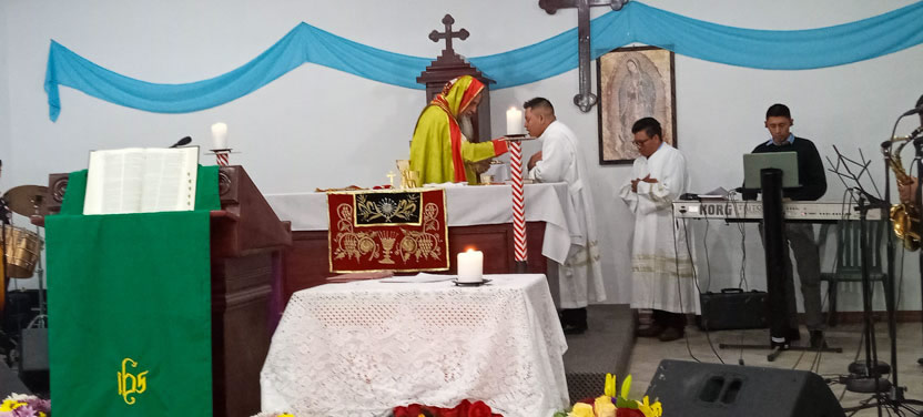 La visita a la comunidad comenzó con la administración del sacramento de la reconciliación a quienes lo necesitron. El hecho de que la energía eléctrica faltara en toda la región, condicionó externamente la celebración. |
