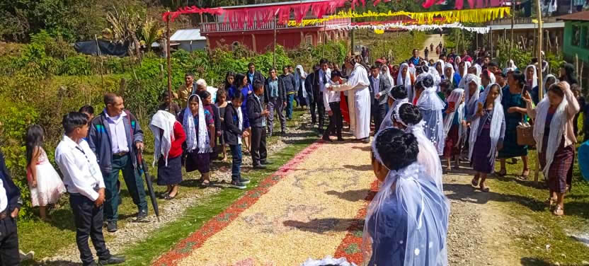 Los heranos prepararon un vistoso recibimiento al arzobispo: arcos, alfombras y flores, en las dos cuadras, desde la carretera principal, hasta el lugar en el que se encuentra el templo. |