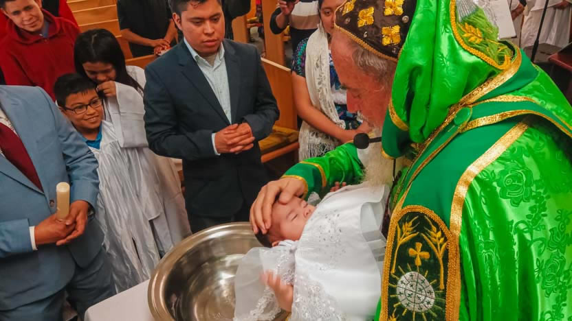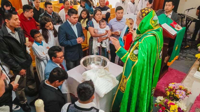 El arzobispo recordó a sus padres y padrinos, todos procedentes de la comunidad Agua Escondida, Cunén, cuáles son sus deberes y compromisos hacia la niña, en orden al crecimiento en la vida en el Espíritu Santo. |