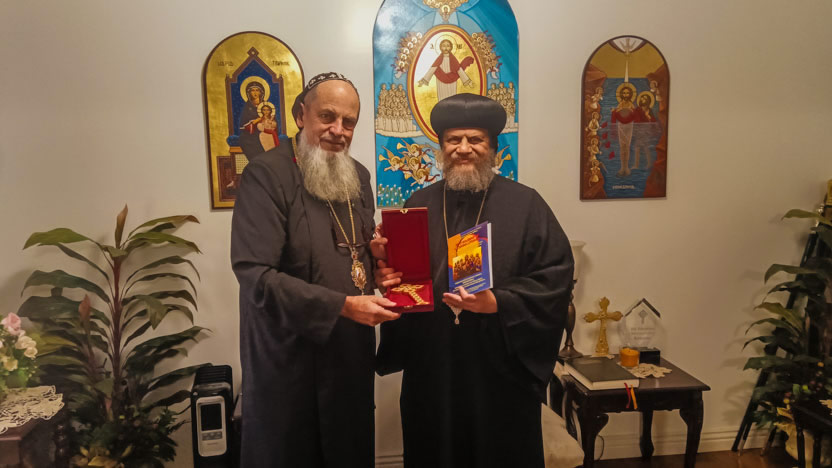 Se Eminencia Serapión presentó a Mor Santiago Eduardo una cruz bendicional de estilo copto y un bastón. Mor Santiago Eduardo, presentó una copia de la Liturgia Solemne de la Arquidiócesis de Centroamérica. |