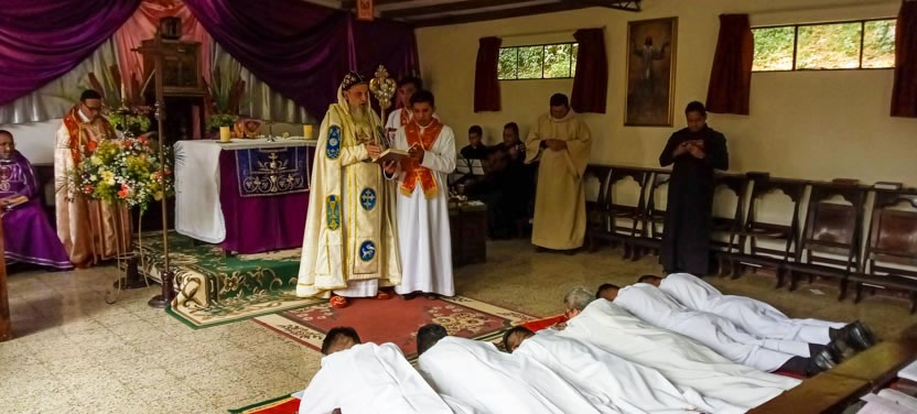 La ceremonia de ordenación comenzó con la tonsura de los candidatos y, seguidamente, con la postración, durante la cual se invocó la efusión del Espiritu Santo. |