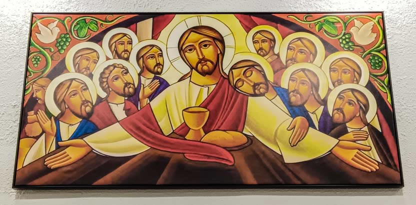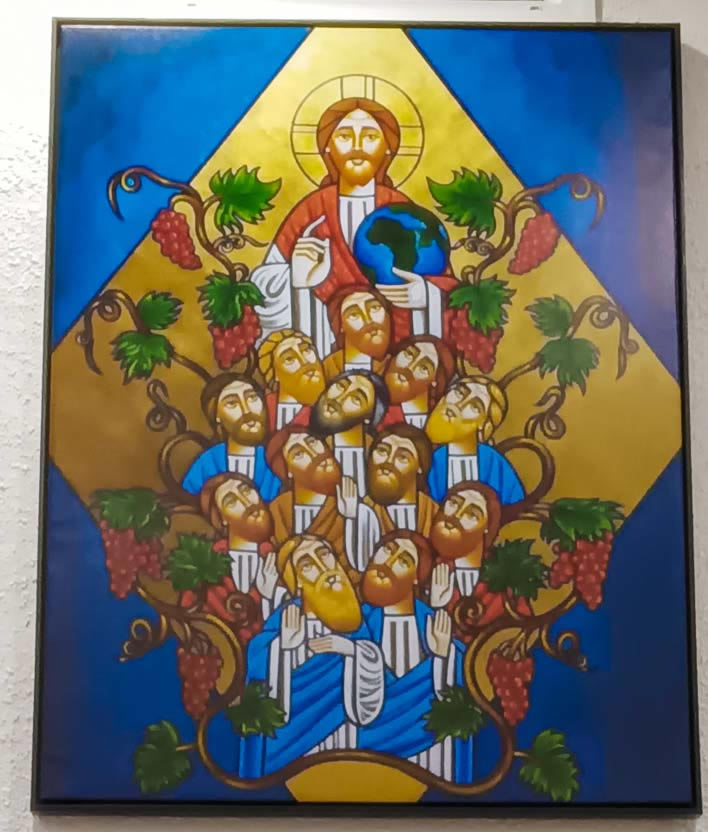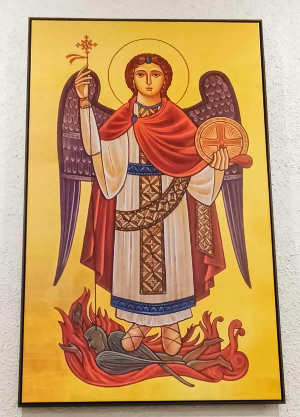 Representando la preparación de la salvación, en la pared primera, se encuentra el icono de San Miguel Arcángel, patrono de la Parroquia y la de la Yoldat Aloho (Madre de Dios), como culminación de toda la preparación y el cumplimiento de las promesas. En la siguiente pared, se encuentran los iconos del Señor resucitado como Señor y Maestro y el del Señor como el todopoderos Rey del Universo. En la pared siguiente, un icono de la última cena, como signo de la actualización continuada de la presencia del Señor en su Iglesia. Finalmente, el la pared frente al altar, el icono de la consumación de la salvación, en donde, en torno al símbolo de la vid, se encuentra el Señor glorioso y los doce apóstoles. |