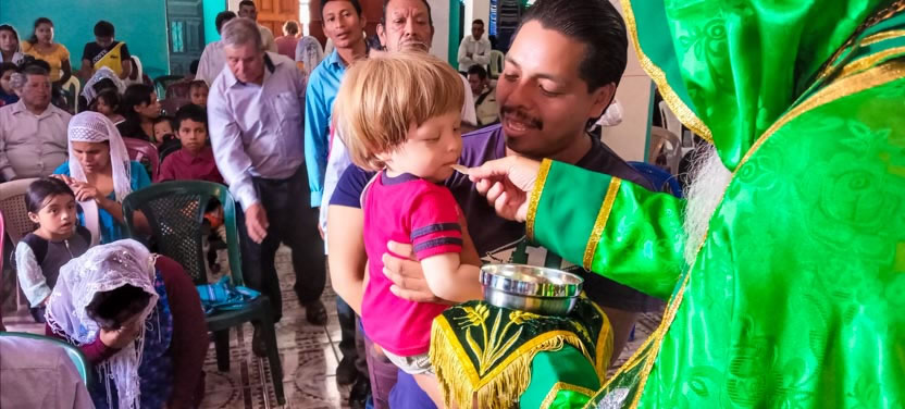 Una característica especial de la comunidad es la participación de numerosos niños, los cuales lo hacen con mucha atención y sincera devoción. |