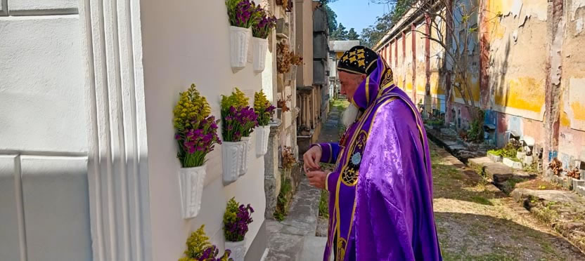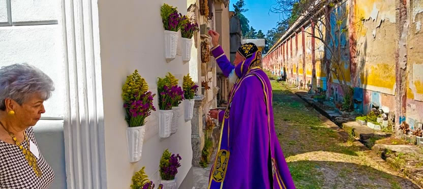 Después del mediodía, el arzobispo llegó hasta el Cementerio General de la Ciudad de Guatemala, para presidir una divina liturgia por la reinauguración del mausoleo en el que yacen los restos de sus bisabuelos y su abuela paterna.