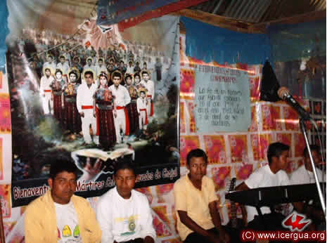 Arriba: Al fondo está el "baner", que representa a los Mártires de Chajul. Enfrente se puede obsdervar a algunos de los componentes del ministerio.