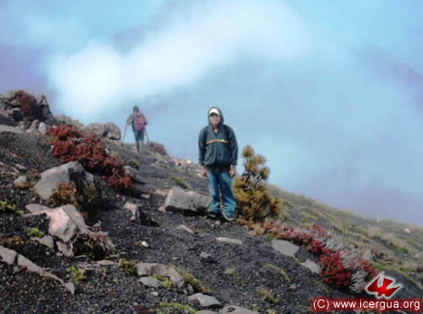 La llegada a la cima del volcán de Fuego, estuvo precedida por momentos de riesgo y tensión. Un viento muy fuerte y una neblina que congelaba, azotaron desde que se llegó al primer pico del volcán, hasta llegar a la meta, ubicada en el tercer pico, a unos pocos metros del cráter.