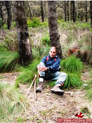 En la foto a la derecha: Después de haber conquistado la cima del Acatenango, comienza el descenso hacia la horqueta, para luego escalar el volcán de Fuego, que se vislumbra en el fondo.