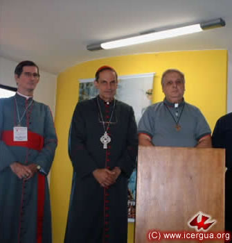 A la derecha: Dom Wagner, nuestro Obispo, Mons. Eduardo y Dom Wagner, Obispo de Sao Paulo, Canciller de ICAB y Vice-Presidente del Consejo de Honor de CICAM, cuando se dirigen al Plano de la Asamble Conciliar de ICAB. Durante la misma, los Obispos miembros de ICAB ratificaron su aceptación de los Estatutos de CICAM. |