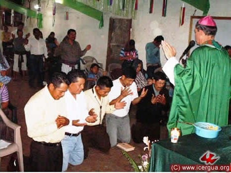 El sábado 4 por la mañana, el obispo visitó por primera vez la comunidad de la Laguna Batzchocolá. Está ubicada en el norte de Chajul, sin embargo pertenece al municipio de Nebaj. Para acceder a la misma, hay que tomar el camino de Chel y poco después de llegar a la ribera del río Azul o Chel, se comienza a escalar la montaña, hasta llegar a la cima, después de una hora y media de camino. Se trata de una comunidad pequeña pero que está trabajando con gran entusiasmo y compromiso, para lograr que el catolicismo renovado logre llevar la Buena Nueva a todos los habitantes. |