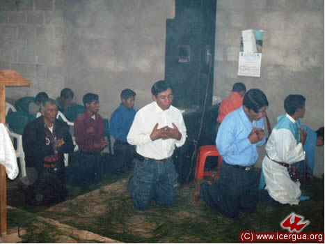 A la izquierda, una vista de la visita a Chuitzanchaj. Los hermanos están en oración profunda, después de haber recibido la absolución de sus pecados.