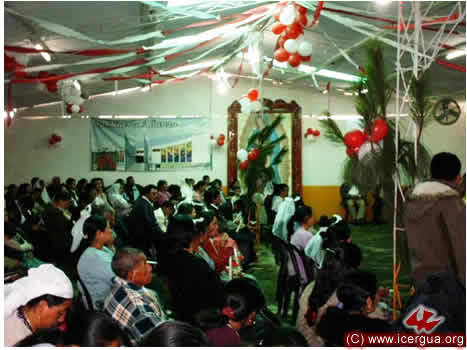 En la pared del fondo se puede observar una foto con el proyecto del nuevo templo que la comunidad ha iniciado a construir. Los hermanos esperan que pronto el proyecto llegue a hacerse plena realidad.