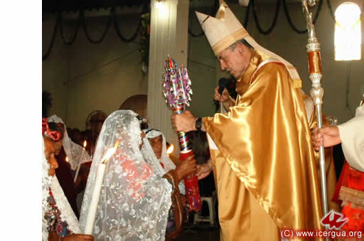 Después de haber sido ungidas con el Santo Crisma por el obispo, las madrinas oran sobres sus ahijadas -en la foto de la izquierda-, pidiendo que los mismos frutos que la efusión del Espíritu produjo sobre los Apóstoles el día de Pentecostés, sean producidos sobre cada uno de quienes han recibido el sacramento de la confirmación. |