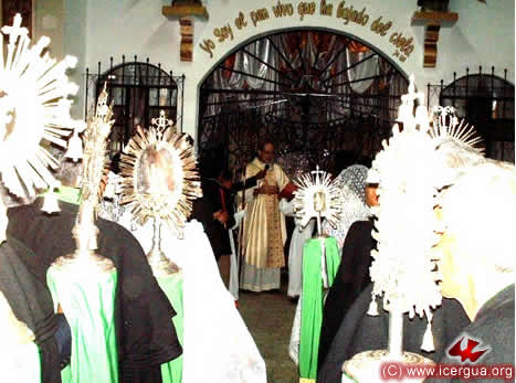 Arriba: Momento en que se prepara la procesión de entrada. Como es tradición, después de los ciriales y la cruz, entran en la procesión las Capitanas y los Cofrades, llevando las insignias propias de su cargo. Luego vienen los Ministros de la comunión, los Acólitos y finalmente los concelebrantes.