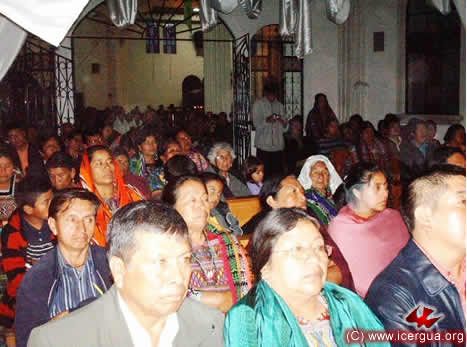 A la derecha: Un momento durante la Homilía. Tanto las lecturas como la homilía fueron pronunciadas tanto en castellano como en Kakchiquel, el idioma propio de los feligreses.