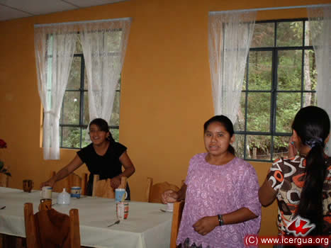 En la foto se pueden ver hermanas provenientes de San Pedro Carchá y Chisec, Alta Verapaz y de Chochal, Chiantla, Huehuetenango. Ellas preparan la mesa, pues después de la Eucaristía el obispo participó en una refacción que le fue ofrecida.