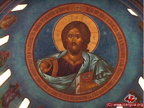 Arriba: Una foto del icono de Cristo Todopoderoso, que se abarca toda la parte interior de la cúpula.