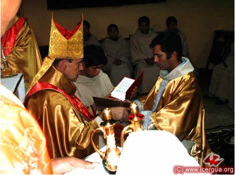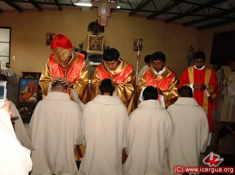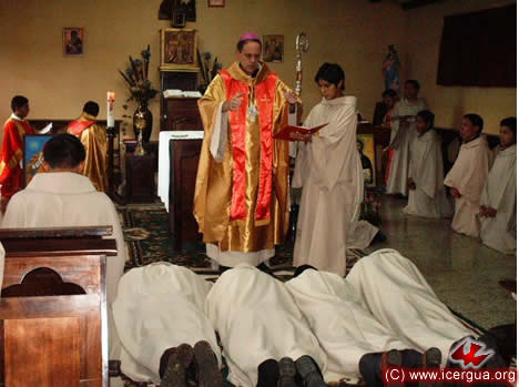 Después de hacer el compromiso de incorporación y de celibato, quienes serán ordenados se postran, mientras todo el pueblo de Dios, de rodillas, cantan las letanías. Al final de éstas, el obispo invoca sobre los que serán ordenados, la efusión del Espíritu Santo. Esto es lo que se puede observar en la foto de la derecha. |