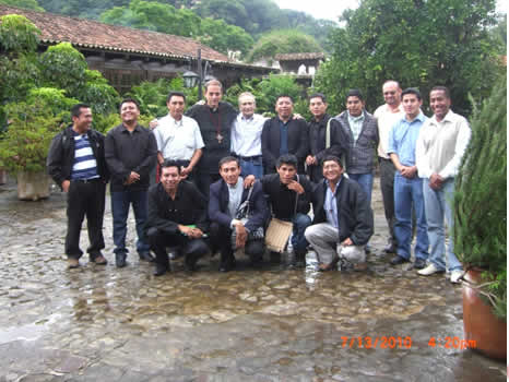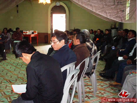 A la Derecha: Los padres Luís Felipe Corimanya y Fredi Mux, participando junto a los demás hermanos en la reunión. Ésta se lleva a cabo en la Iglesia de San Miguelito, en la parte alta de Santa Eulalia.