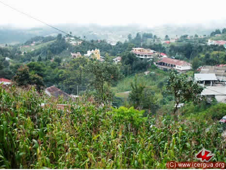 Desde la Iglesia de San Miguelito, se tomó la foto de la izquierda, en la que se puede observar, en el área que ocupa el primer árbol de la derecha, el área en la que será construida una parroquia central para la cabecera municipal de Santa Eulalia. Los hermanos han comprado dos mil dos cientos metros cuadrados para poder realizar la construcción. |