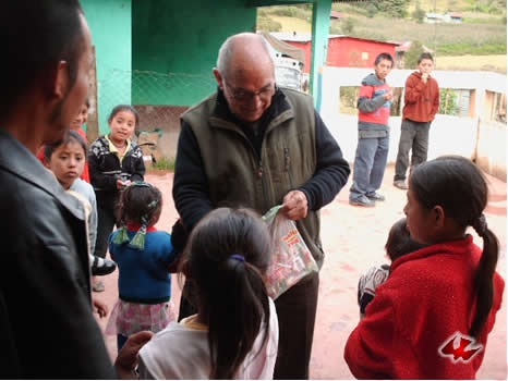 El día 26 de Julio llegó a Guatemala el hermano Dámaso Mateo. Español, de 70 años, después de haber llevado una vida como profesional y de haber trabajado intensamente en diversas iniciativas pastorales, tanto en España como en Perú, ha llegado para unirse a la Iglesia. Su meta: culminar la formación que, en diferentes etapas y lugares ha realizado a lo largo de los años, para poder acceder a las órdenes sagradas. El fin de semana inmediato a su llegada, acompañó a nuestro obispo en su gira apostólica. En la foto de la izquierda se le puede ver repartiendo golosinas a los niños de Cololaj, San Rafael la Independencia, Huehuetenango, después de que terminó la Ecuaristía. |