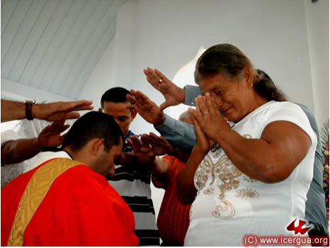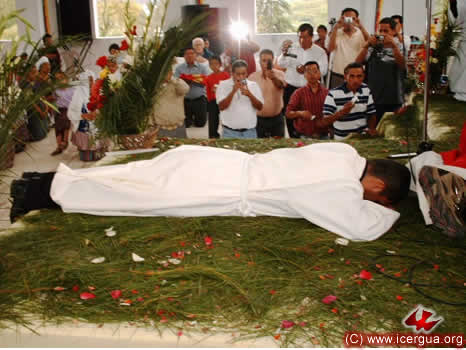 A la izquierda: José Armando está postrado, en señal de su total entrega y sumisión a Dios, mientras el coro canta la letanía de los santos, implorando la efusión del Espíritu Santo. |