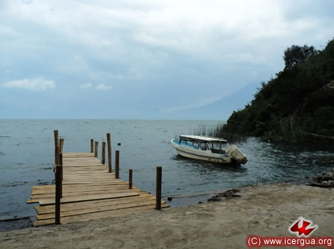 Arriba: Una vista del muelle, a la llegada a Tzununá. Durante la época de lluvia hubo que hacer cinco veces el muelle, pues el nivel del lago constantemente subía.