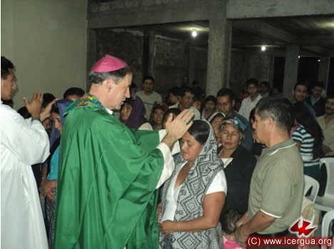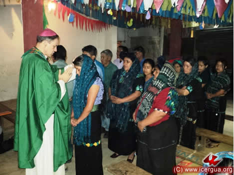 Arriba: El obispo fue recibido a la entrada de la Aldea por el Padre Santos Acosta Sol, responsable pastoral de esta área y por representantes del Pueblo de Dios. Desde allí se realizó una caminata hasta el centro de la Aldea, en donde se celebró la Eucaristía.