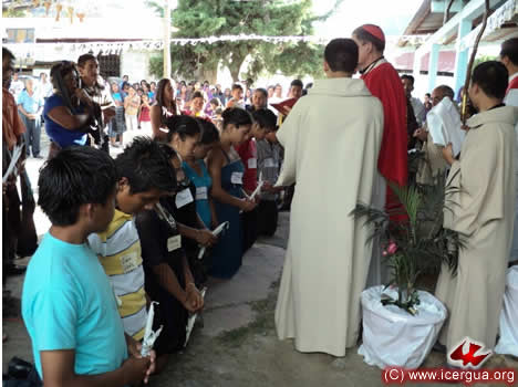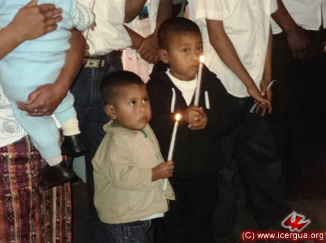 También por la tarde del día 22, Monseñor Eduardo visitó a una de las dos comunidades católicas renovadas del centro de municipio de Santa María Chiquimula. Antes del inicio de la celebración Eucarística y de los bautismos, el coro infantil de la comunidad cantó una serie de cantos de avivamien-to. Fue muy hermoso ver la manera en la que los hermanos han logrado que los niños se vayan involucrando activamente en la vida de la comunidad. |