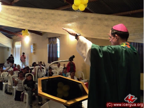 A la izquierda: Momento en el que, después del agradecimiento expresado por el Padre Santos Acosta Sol y por los líderes de la comunidad, el obispo imparte la bendición final. |