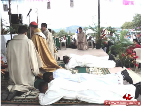 A la izquierda: los cuatro diáconos están postrados por tierra, mientras el pueblo de Dios, de rodillas ora, pidiendo la asistencia del Señor y la efusión del Espíritu Santo, para que los cuatro candidatos sean consagrados como Presbíteros.