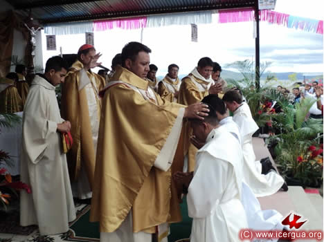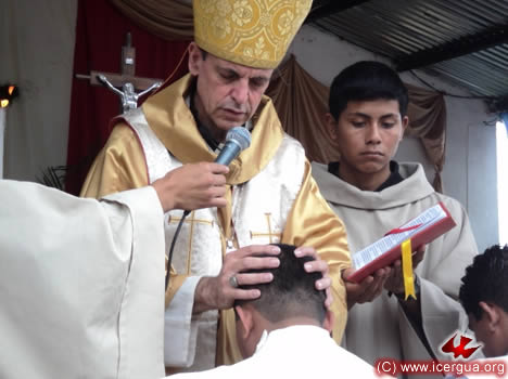 Uno de los momentos centrales del rito de ordenación lo constituye la imposición de las manos del obispo, seguida de la epíclesis y oración consagratoria. A la derecha: el obispo mientras impone las manos al diácono José Armando Hernández. Seguidamente las impondrá al diácono Marco Tulio Calderón. |
