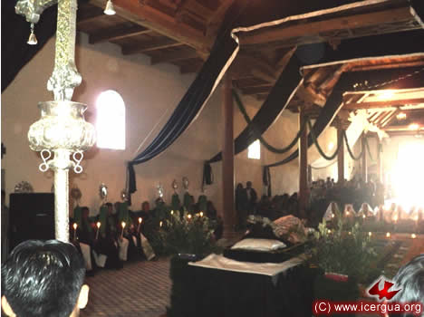 A la derecha: se puede observar la hermosa alfombra de aserrín que fue preparada para la ocasión. En el fondo los miembros del coro San Juan, se preparan para acompañar la celebración.