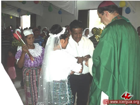 Por la tarde Monseñor visitó la comunidad de Tierra Caliente en Sacapulas, el Quiché. Dos parejas contrajeron matrimonio y durante la celebración, también se administró la iniciación cristiana a cuatro niños, dos de los cuales eran hijos de las parejas que también estaban contrayendo matrimonio. |
