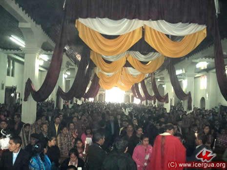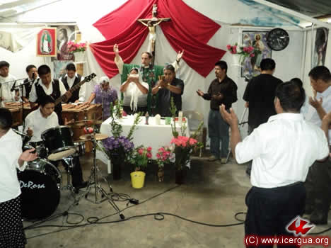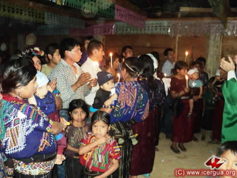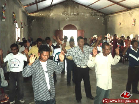 Con ocasión de la celebración unos ciento cincuenta ministros de la parroquia de la Glorificación de María, de Santa Cruz Barillas, hicieron la renovación anual de sus compromisos. A la derecha se puede observar uno de los momentos en los que los ministros están sumidos en profunda oración. |