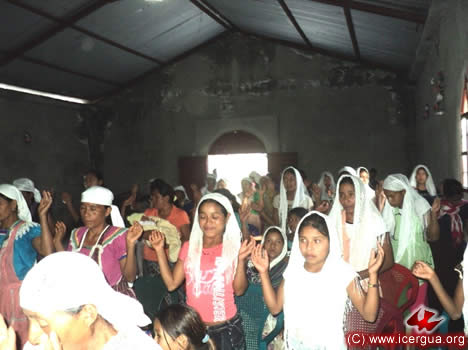 Como es costumbre en la mayor parte de las comunidades, los varones ocupan un lado del templo y las mujeres el otro. En la foto de arriba puede observarse a los hermanos orando por la salud del hermano Juan, mientras a la derecha las hermanas oran por la misma intención. |