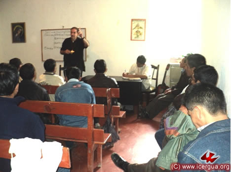 A la derecha: el obispo da la forma-ción a los representantes de las comunidades. Frente al obispo, a la izquierda, se encuentra el Padre Bernabé. A la derecha del obispo está el Padre Denis, quien ha esta-do ejerciendo su ministerio, primero como diácono y actualmen-te como presbítero entre los hermanos de Uspantán.