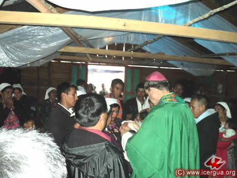 Hacia el medio día, el obispo presidió la celebración de la Eucaris-tía en la Aldea Pojom. La visita abarcó dos etapas: durante la celebración de la misa, un numeroso grupo de jóvenes, diligentemente preparado, recibidó el sacramento de la confirmación. Luego se celebró la bendición del nuevo templo, que está en proceso de ser terminado. |