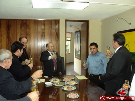 El acto concluyó con el brindis de protocolario. En la foto, el seminarista Dámaso Mateo, Secretario de la Escuela, el Padre Juan Moisés, nuestro obispo, el Doctor Reyes, el Licenciado García y el Lic. Federico Aguirre, hermano del obispo y canal de comunicación para los contactos con la Universidad. |